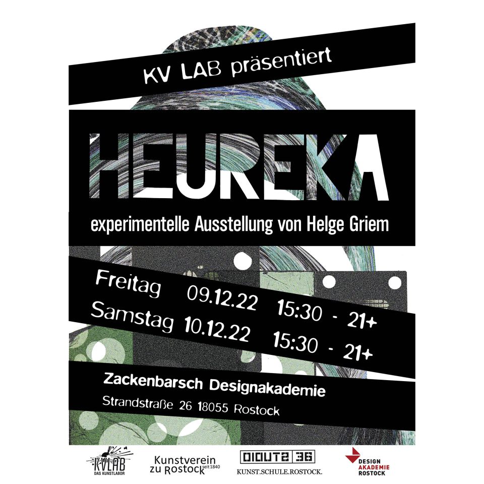 Es ist wieder so weit, das experimentelle Kunstlabor vom Kunstverein Rostock öffnet seine Türen. Dieses Mal wird der Zackenbarsch in der Designakademie Rostock vom Künstler Helge Griem zur Laborstation umfunktioniert. Das KV Lab und die Designakedemie Rostock präsentieren euch frei nach dem Motto „Heureka“ („Ich habe es gefunden“) eine Ausstellung, in der ihr die Möglichkeit habt, selbst Kunst zu erschaffen und im experimentellen Umgang mit den vorgegebenen Strukturen euren eigenen Ausdruck zu finden. Also packt eure Laborausrüstung zusammen und findet euch in der Designakademie Rostock ein.